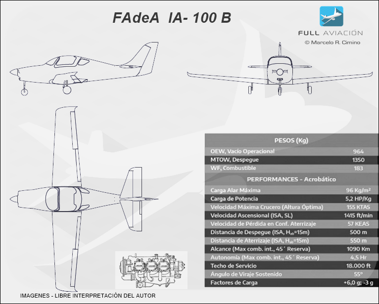 Puntualmente, el IA-100B será un entrenador militar puro, biplaza lado a lado acrobático, construido en materiales compuestos, según especificaciones FAR Parte 23 Acrobático (AIRWORTHINESS STANDARDS: ACROBATIC, CATEGORY AIRPLANES”). El mismo cubrirá el patrón de instrucción Elemental/Primario (abanico de las primeras 80 o más horas de vuelo). Tendrá ala baja cantiléver trapezoidal de perfil laminar, con flaps ranurados de accionamiento eléctrico, dotado con punteras de ala con wind tip y tren de aterrizaje retráctil triciclo. Será propulsado por una planta de poder Lycoming AEIO-540, de la serie D, con una potencia de 260 hp.